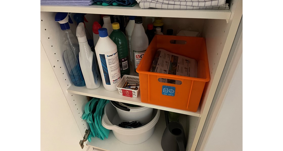 Papir og pap bliver puttet i en orange kasse i et skab ved siden af rengøringsartikler, mens de ikke ønsker at have en beholder stående fremme til tekstilaffald.
