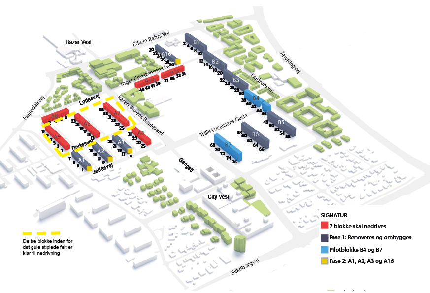 Ud over de tre blokke på Dortesvej er der tale om A8 på Lottesvej, A4 på Jettesvej og blokkene A13 og A15 på Inger Christensens Gade - her har enkelte beboere ikke ønsket at tage imod boligforeningens tilbud om genhusning og har gjort indsigelse mod at skulle flytte. En opstart på nedrivningen af disse blokke afventer derfor en afgørelse ved boligretten.