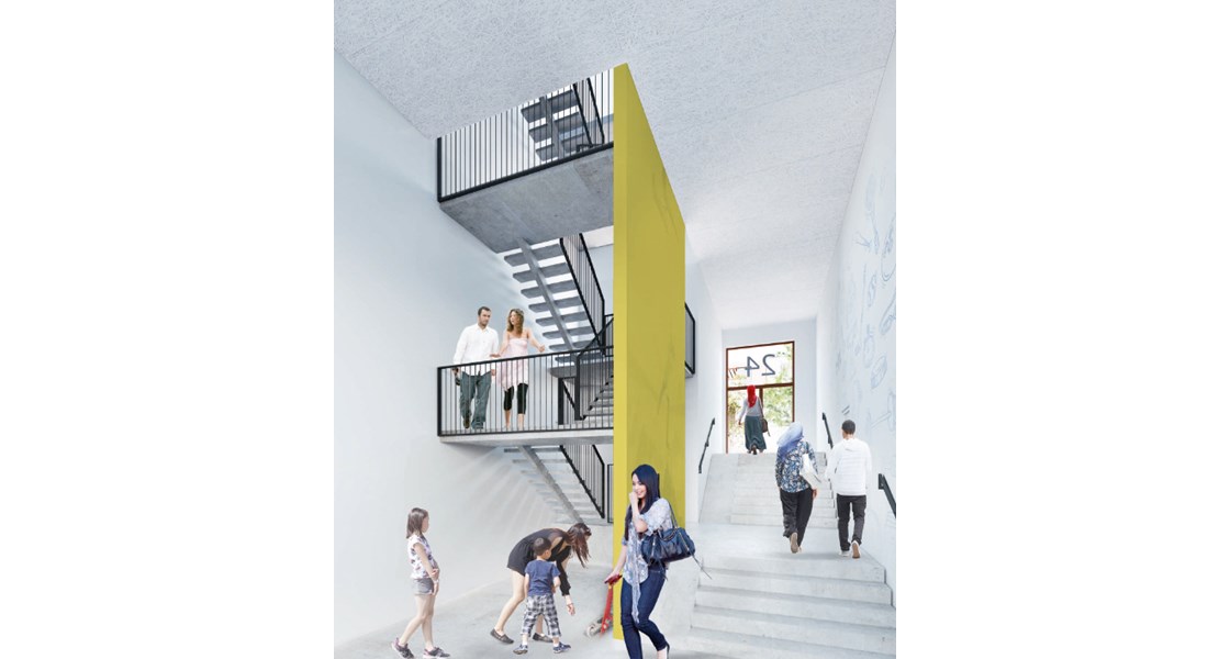 Renoveringen af blokken vil skabe et bånd af nye toetagers byhuse i de to nederste etager af den eksisterende blok. Bl.a. fremhæves trappe-gennemgangsrummet som en god løsning, der sikrer gode dagslysforhold og en venlig og tryg modtagelse for beboerne. Se visualisering 3.